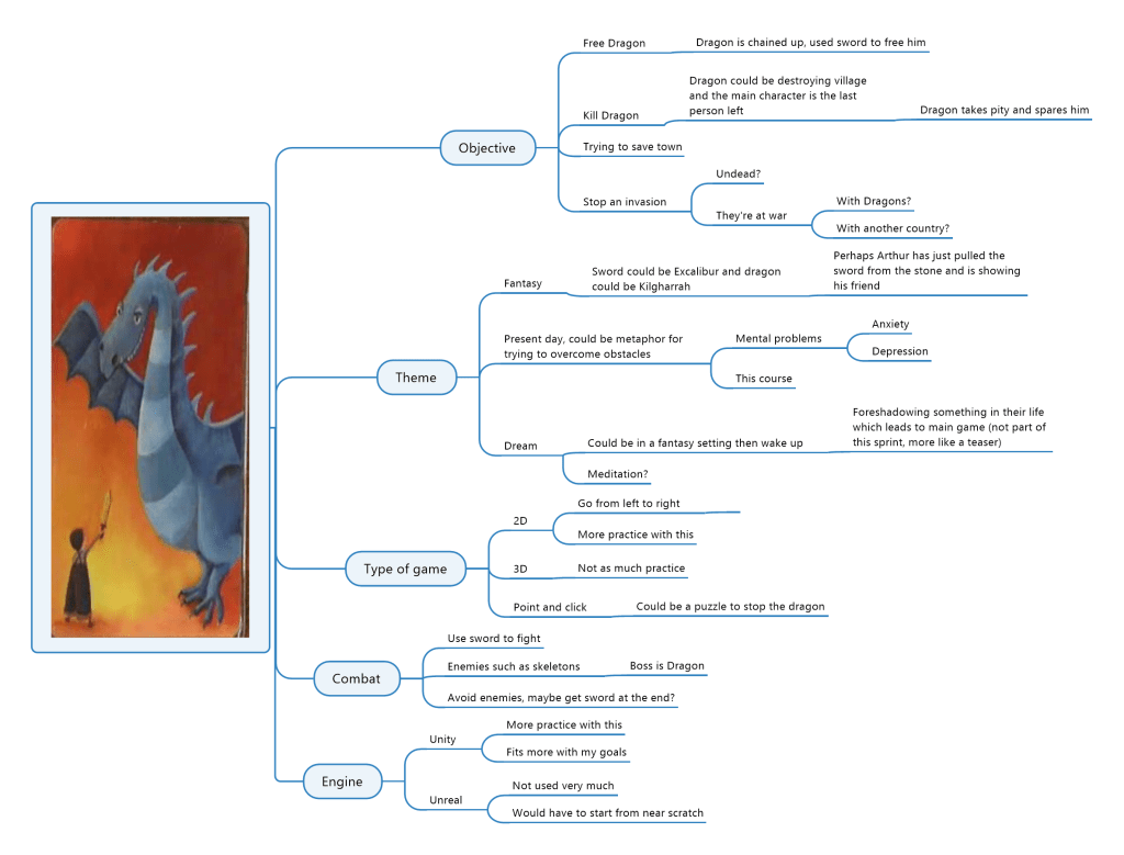 I felt better after getting the theme and receiving the advice from Giovani and Gareth. When the theme was revealed I felt relief, it showed a person holding a sword up to the dragon and the ideas came flooding in. My first idea was to have the dragon ask the user questions and if the user got them wrong they were killed but Cooke (2021) explains perhaps it’s not the best thing to go with your first idea. I therefore decided to create a mind map of potential ideas.