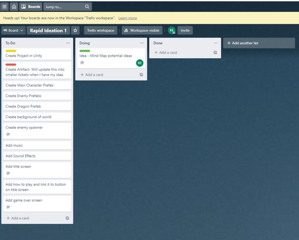 I am currently working full time (7:30am – 6pm) Monday to Friday so organisation is key. I decided to make a trello board of tasks. This will help break down what I need to do and help me see the overall vision for the game. Drake (2018) wrote a review for Trello and says it’s easy to use and free which is ideal. I also have a lot of experience using this at work so I already know how it works. I added a few tickets to the trello board which has given me a good overview. Naik and Jenkins (2019) researched the effectiveness of using a Trello board for creating games as part of a competition with undergraduate courses. The researched showed that grades went up by 11% which shows how effective this can be so I will make sure to carry on using this in the future.