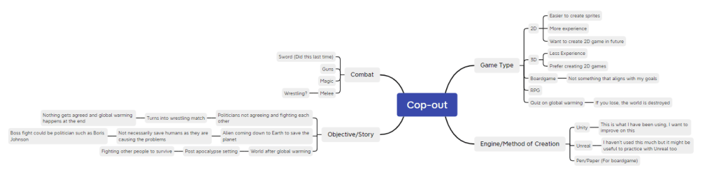 I struggled for ideas to begin with but decided to create a mind map (Fig 1) again as I have learned that this helps me think of ideas. I did get a few from it but I really like the Alien coming to Earth to help save the planet. I also like the idea that they can use magic and they can use this to fight things such as greenhouse gasses. It will build up from there, I plan to include a few levels.